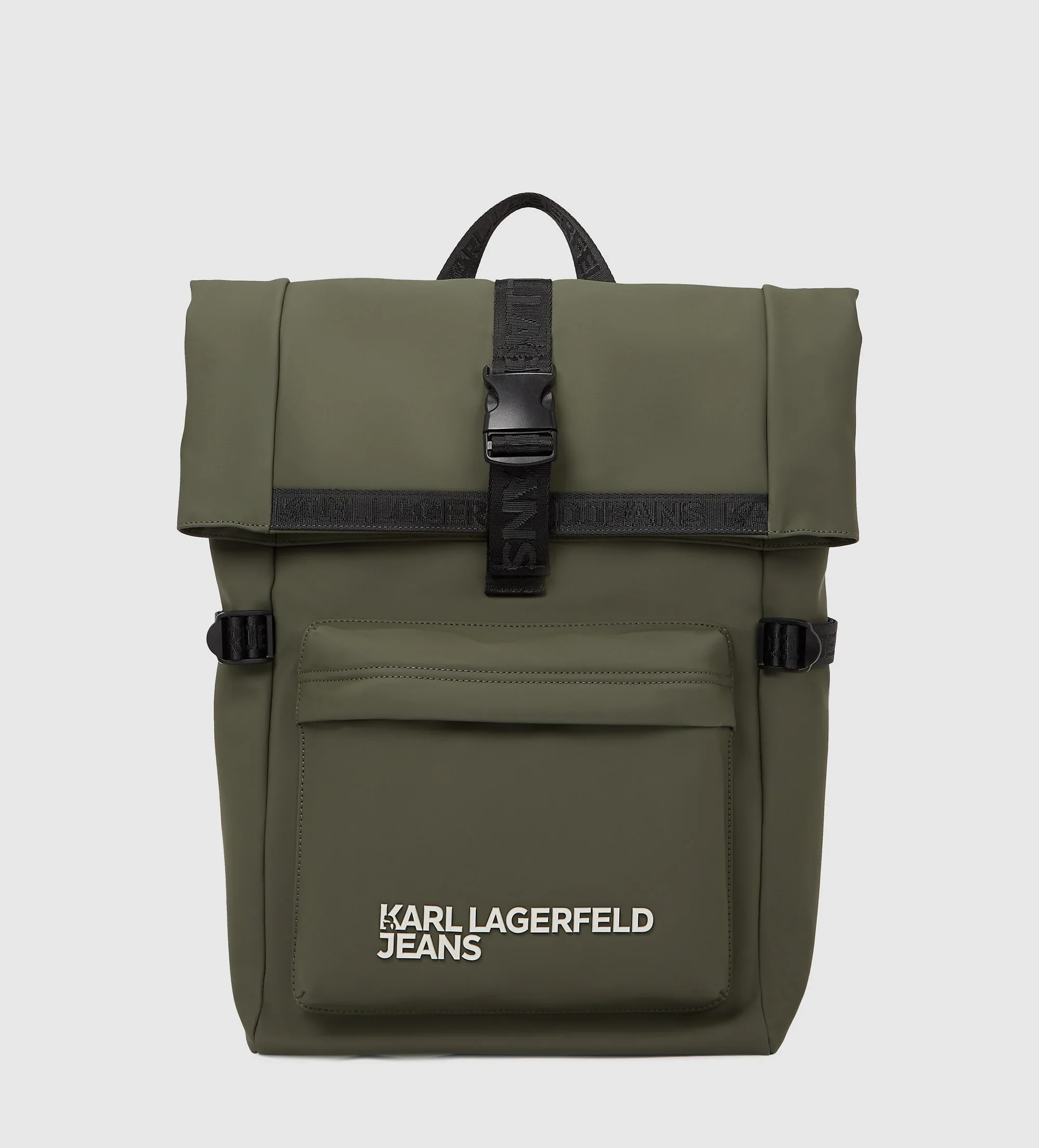 Crafted from coated technical leather, this backpack showcases a spacious roll-top design with a secure zip and buckle closure. Practical details like a top grab handle and adjustable shoulder straps ensure comfort and ease. At the same time, the front pocket — finished with a bungee cord puller and bold KARL LAGERFELD JEANS logo — delivers a standout statement.