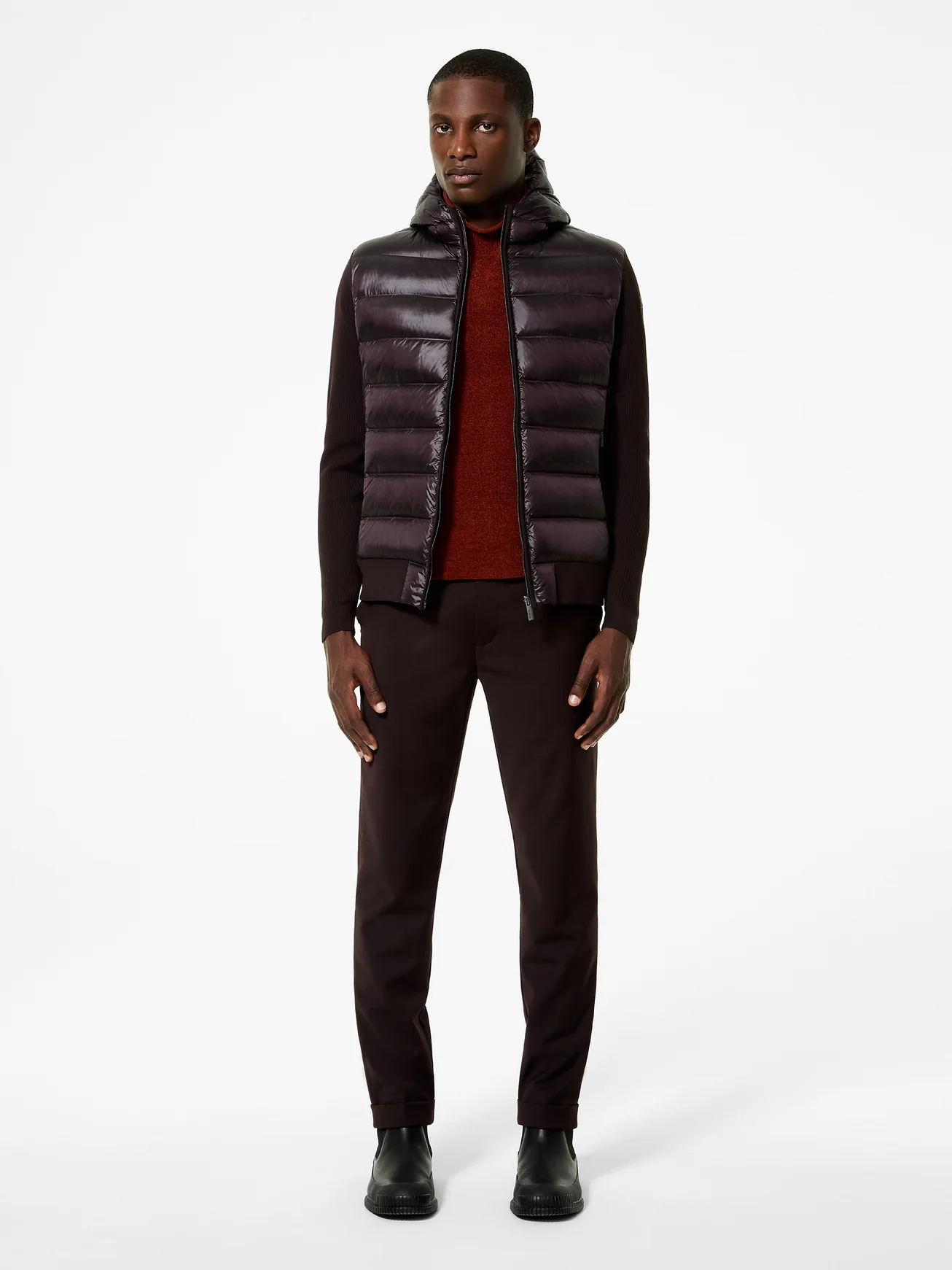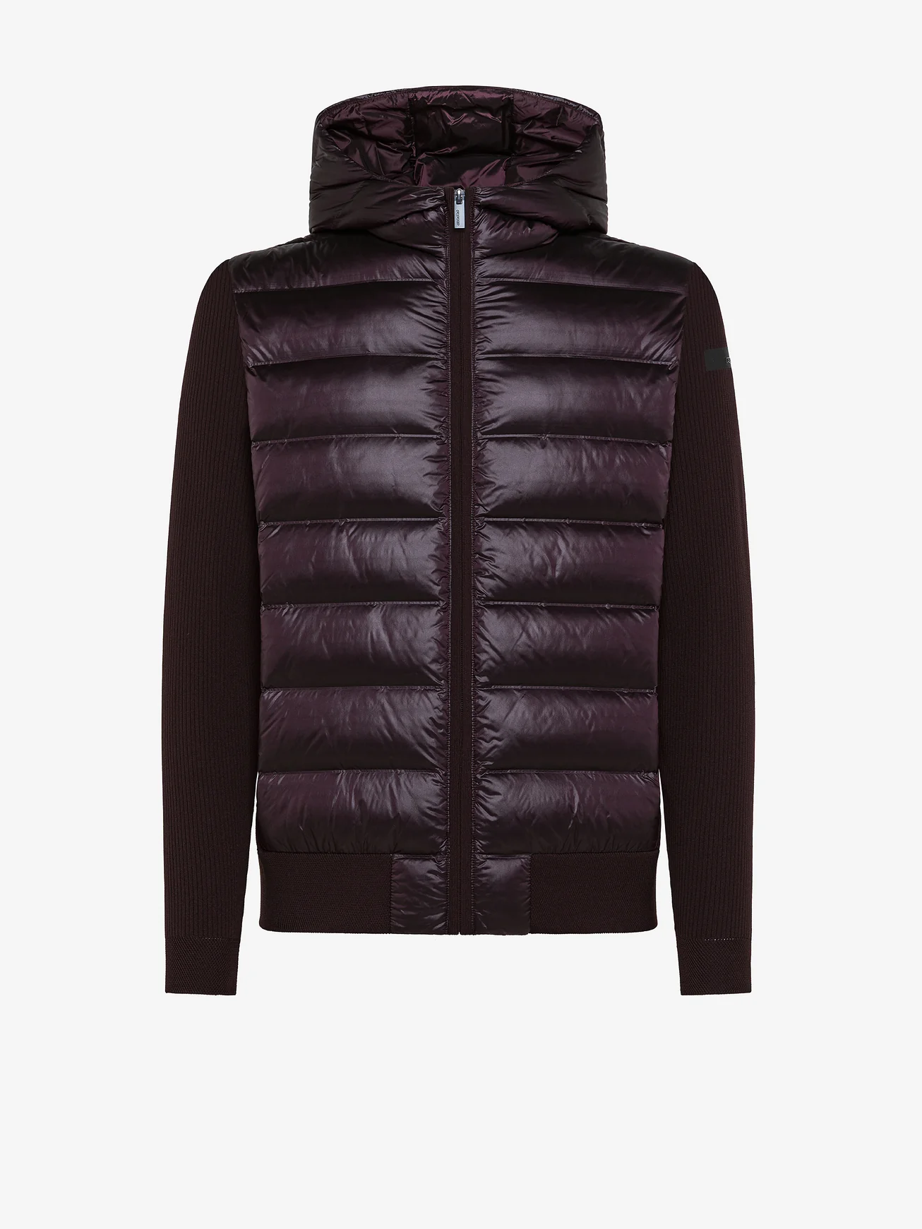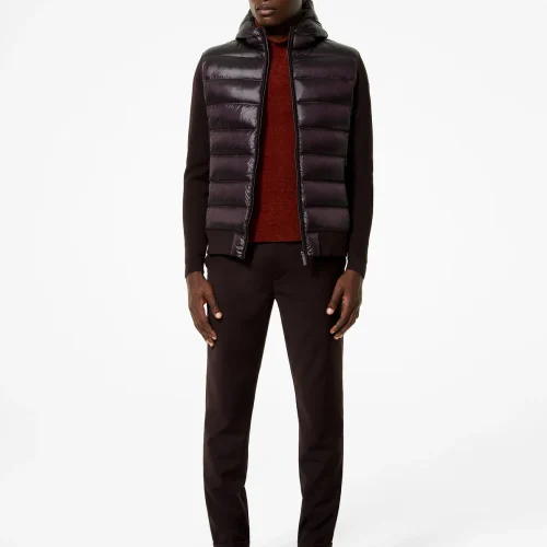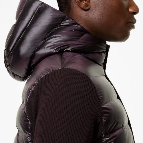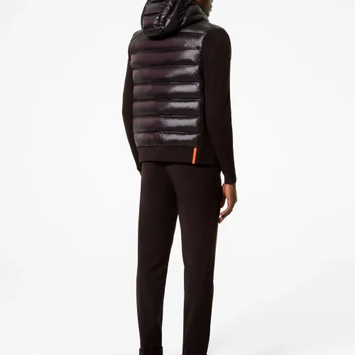 The torso and fixed hood feature tubic channels filled with light 90/10 duck down padding, offering warmth without bulk. The seamless texture enhances the clean lines, while ribbed, elasticated sleeves ensure flexibility and comfort. A spiral front zipper runs up to the collar for a sleek finish, complemented by two invisible side pockets for practicality.
